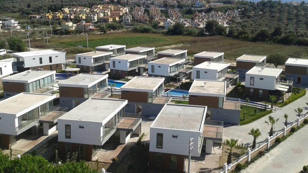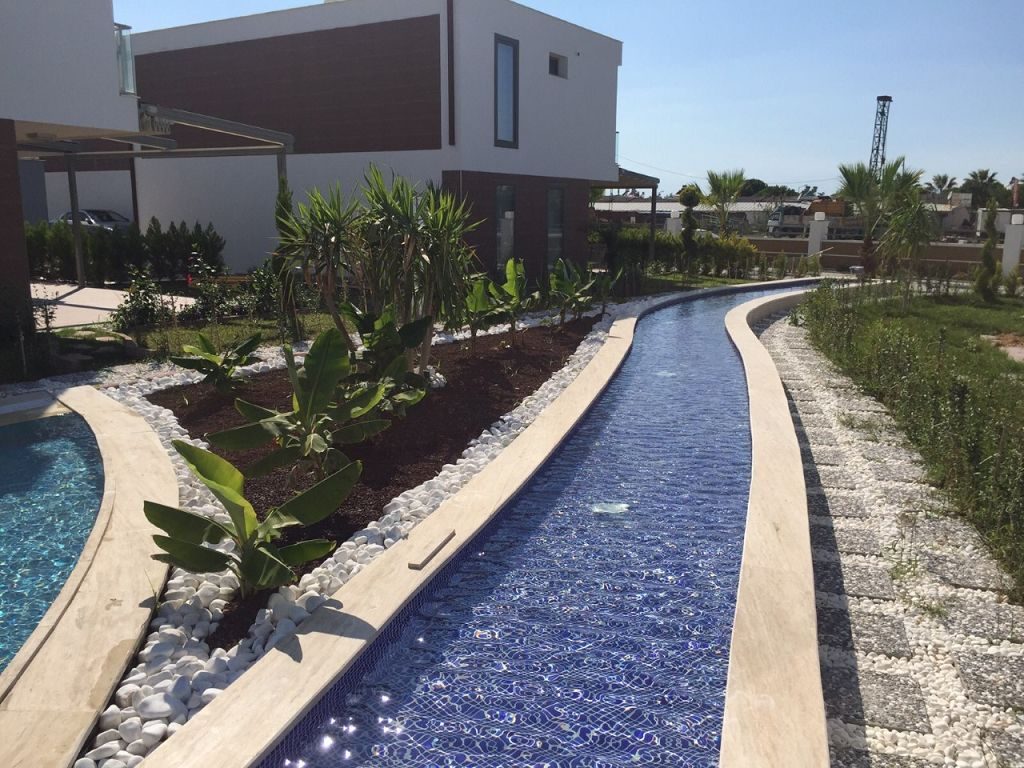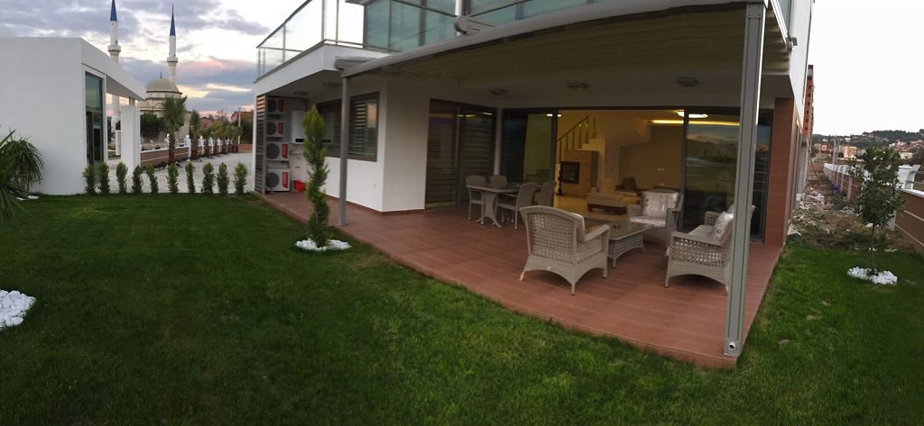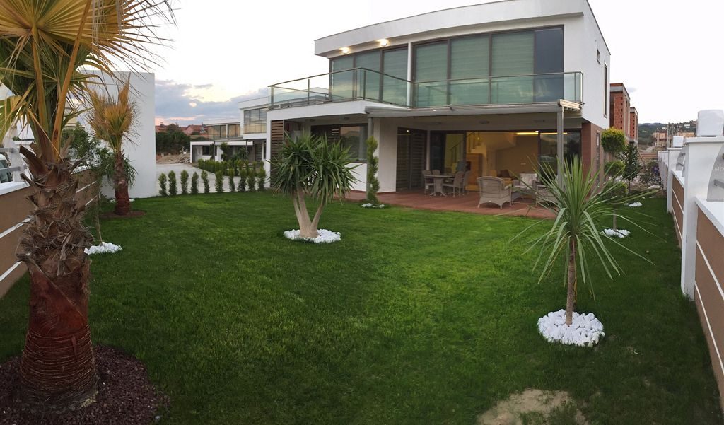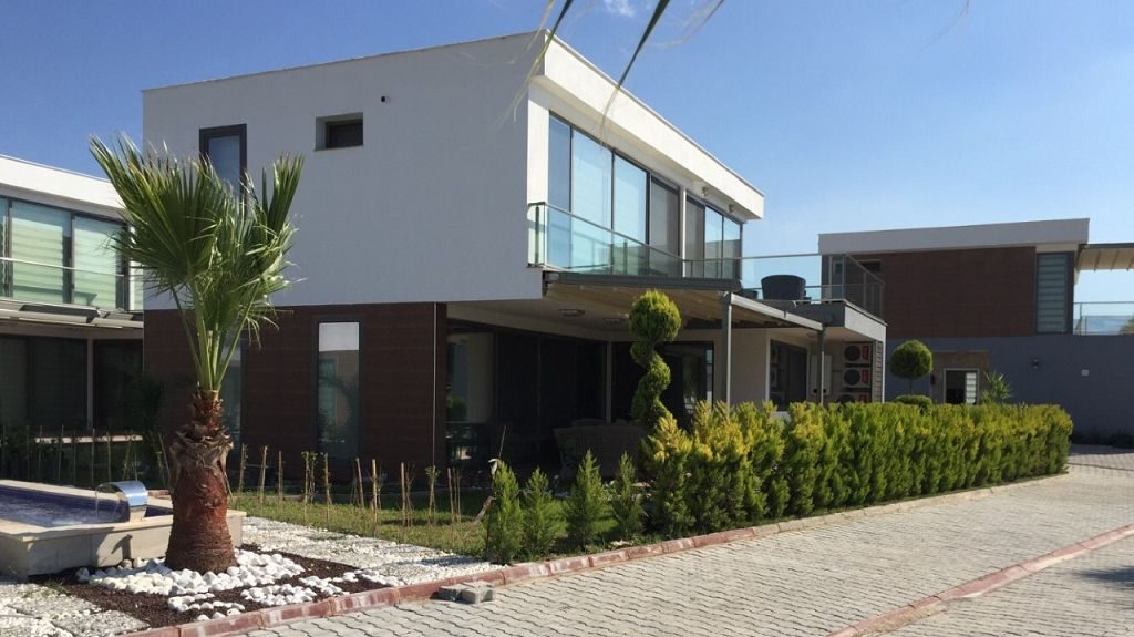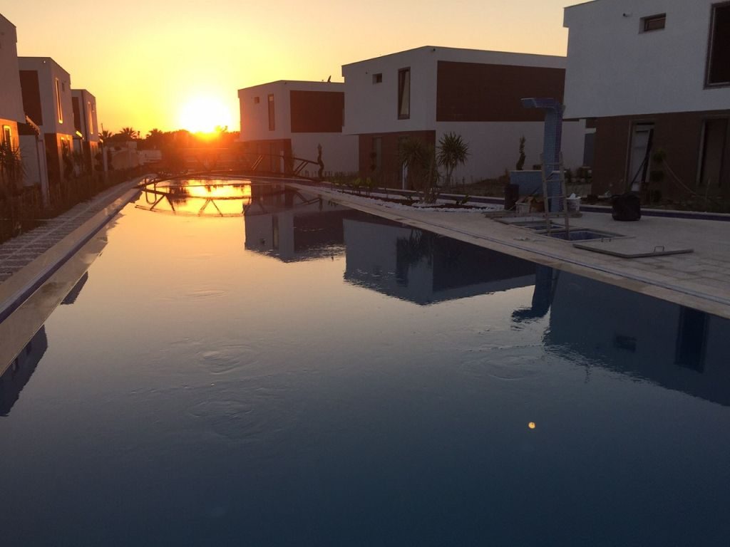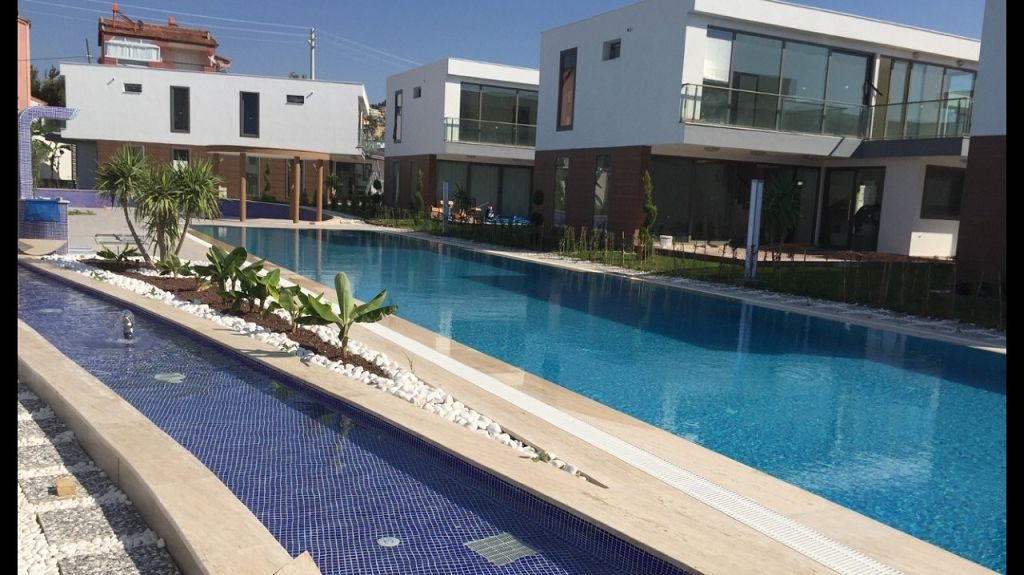 Es ist ein Neubau Villa Viertel mit 24 Villen auf 8500 m2 deren Fertigstellung Ende 2015 war mit einer sehr Exklusiven Ausstattung und hoher Bau Qualität . Die Villas haben ein Gemeinschafts Pool mit 200 m2 mit Kinderpool der extra ist. Durch das Villen areal geht ein Künstlich Angelegter Waasergraben durch der Abend Beleuchtet ist. Die Villas haben 3 Schlafzimmer + 1 wohnzimmer , 2 Badezimmer und 3 WC ´s ,  140 m2 Wohnfläche auf 2 Etagen, Terasse + Balkon mit 47 m2 mit einem Autostellplatz. Gesamt Grundstücksfläche des Hauses mit Garten sind 360 m2.