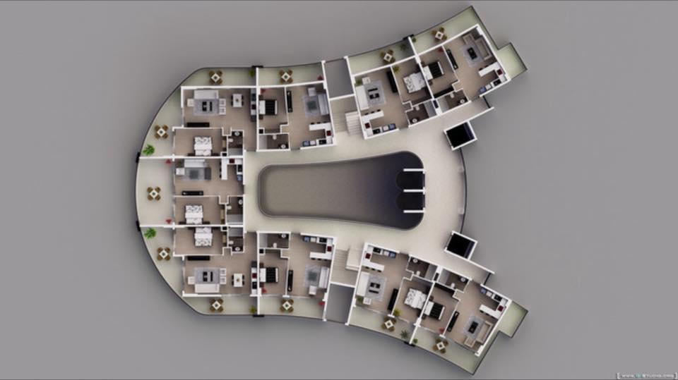 Die Wohnanlage besteht aus einem 1 Block mit 12 Etagen und 108 Wohneinheiten davon sind 103 Apartments 2 Zimmer Wohnungen mit 80 m2 – 111 m2 und   3 x 3Zimmer Duplex / Penthouse Wonungen mit 250 m2 , 2 x 4 Zimmer Penthouse Wohnungen mit 265 m2.